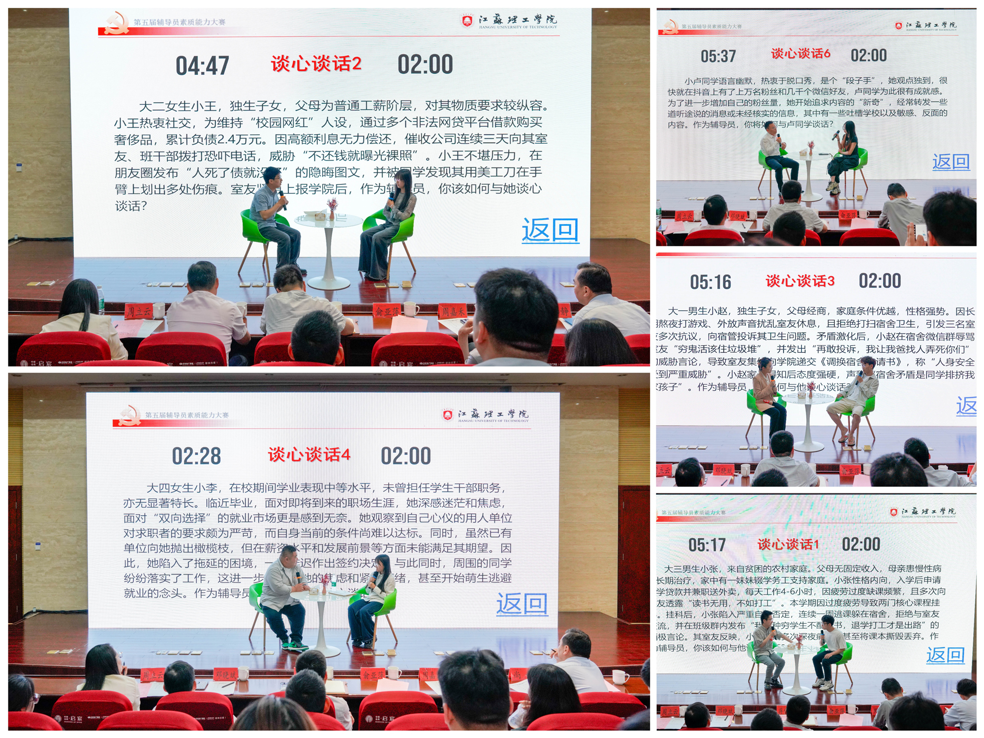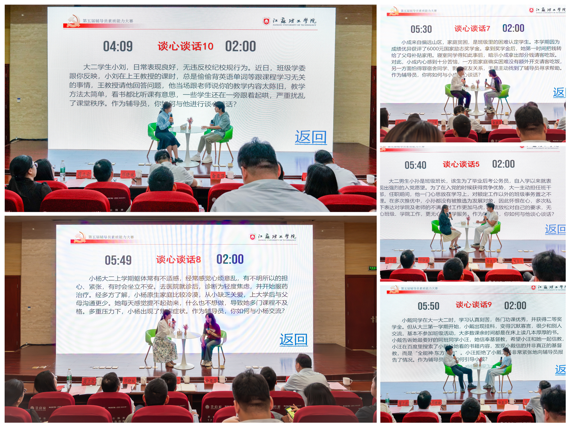 本次比赛由案例研讨和谈心谈话两场比赛组成,全面考察辅导员的政治素养、逻辑思辨、沟通协调及问题解决能力。案例研讨比赛辅导员两两分组,在个人阐述和互相提问中,共同辨析原因、研讨对策、总结规律。辅导员们聚焦服务学生成长成才的工作目标,围绕思想引领、身心健康、成长支持、日常管理等各方面现实问题,针对案例抽丝剥茧,层层深入,展现出良好的现场应变和逻辑思辨能力。谈心谈话比赛,辅导员围绕案例,与助演学生展开一对一深度交流。辅导员与助演学生模拟真实工作场景,通过倾听共情、精准引导、政策解读等方式,直击学生思想困惑与现实难题。从学业压力疏导到职业规划指导,从情感问题干预到网络舆情应对,选手们以扎实的理论功底与灵活的沟通技巧,展现了辅导员“春风化雨、润物无声”的工作艺术。