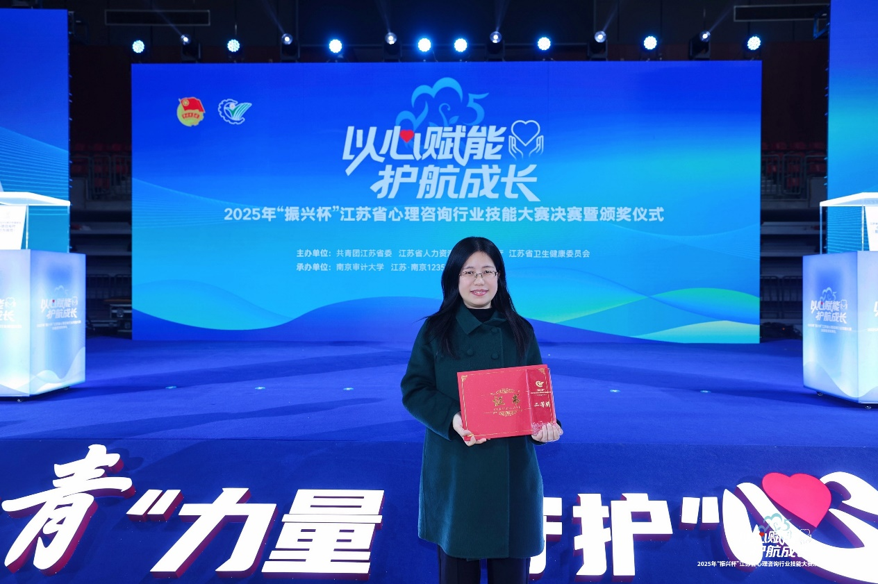 近日,由共青团江苏省委、江苏省人力资源和社会保障厅、江苏省卫生健康委员会联合主办的首届“振兴杯”江苏省心理咨询行业技能大赛决赛在南京审计大学圆满落幕。心理健康教育中心许惠芳老师凭借扎实的专业功底、娴熟的实操技能和出色的现场表现,从全省13个设区市选拔出的480余名参赛选手中脱颖而出,以综合排名第四的优异成绩,斩获大赛二等奖。